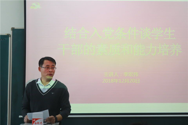 活动伊始,与会老师及全体学员齐唱国歌。学院专职组织员薛勇宣读了培训计划,并强调每一位学员要做到严格要求自己,认真完成学习和考核任务,争取早日成为一名光荣的共产党员。随后,季宏伟老师以结合入党条件谈学生干部的素质和能力培养为题为大家讲授了培训班的第一课。首先提出同学们要端正自己的入党动机,他强调,只有思想上入了党,组织上才能入党,入党不是盲目的跟风,而是自己主观意识的驱动,是对党的崇高敬意和向往。进一步对学员们的素质和能力培养作出要求,通过yL23411永利官网登录历届优秀学生的成功事例告诫全体学员要树立远大的人生理想和奋斗目标,生活中要做到严于律己、严以修身,学习工作中要珍惜时间,把握机会、争取荣誉,在学院学团工作的各方面要讲奉献,起表率做先锋。
