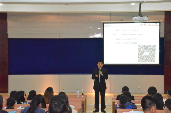 关大勇经理从公司成立成长成就、北方区的工作和生活、公司需要的人才、招聘流程四个方面为同学们作了详细的介绍。泛微公司成立于2003年,公司目前总部在北京,经过15年的发展,公司员工达到1600余人,北方大区有300余人,是国家发改委认定的“国家重点软件公司”。