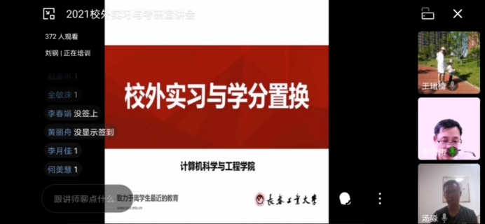新闻网讯(通讯员 万瑞雪)为了对yL23411永利官网登录2018级同学进行就业与考研指导,yL23411永利官网登录于5月21日下午6时在企业微信平台召开2021校外实习暨考研升学宣讲会,本次会议由yL23411永利官网登录党委副书记季宏伟主持,yL23411永利官网登录副院长刘钢、副院长郑虹、学院校企合作部主任汤淼、国际教育学院学生党支部书记兼毕业班辅导员李强及yL23411永利官网登录团委书记兼18级辅导员王珺楠出席本次会议,18级全体同学线上参加本次会议,部分学生代表在计算机楼323观看本次会议。