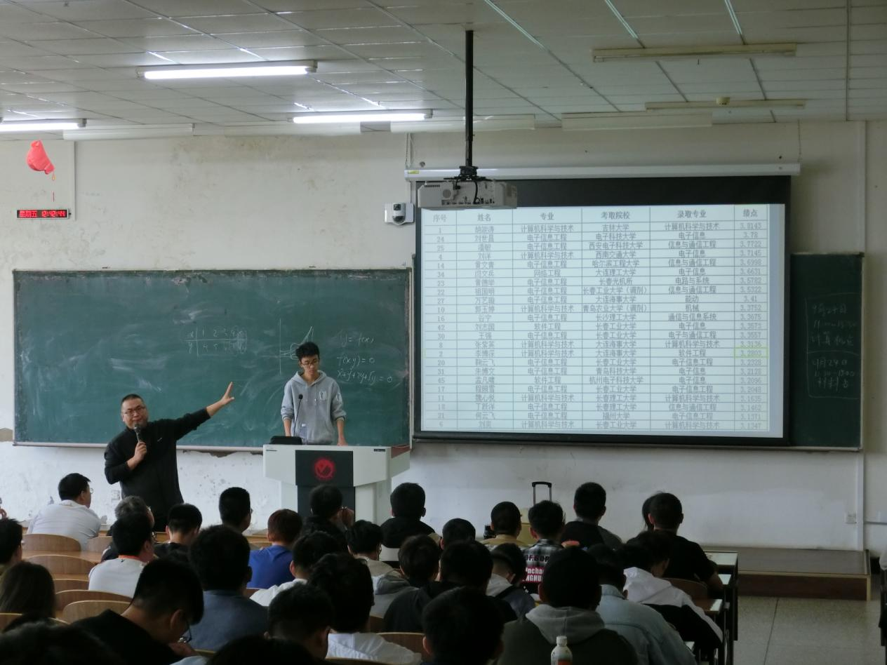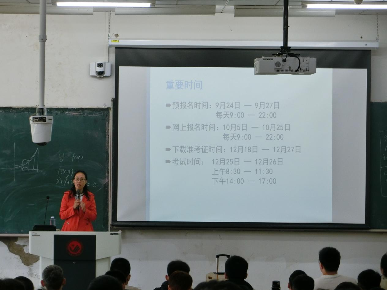 会议伊始,郑虹老师为同学们讲解了如何精准报考,并对报名时间、考研形势等方面做出了具体分析。她提出:考研的路很辛苦,贵在坚持。同学们要准确定位,明确目标,理性选择合适的学校和专业。并且做好计划,合理分配时间,认真复习专业课和公共课。随后,王珺楠老师为同学们做了总结,他列举了往年的成功及失败案例,帮助同学们理性分析原因,并结合往届同学的经验给参加考研的同学指明了考试方向并给予了宝贵意见,他诙谐幽默的讲话风格不仅舒缓考研同学的压力,而且有助于同学们增强自信心。